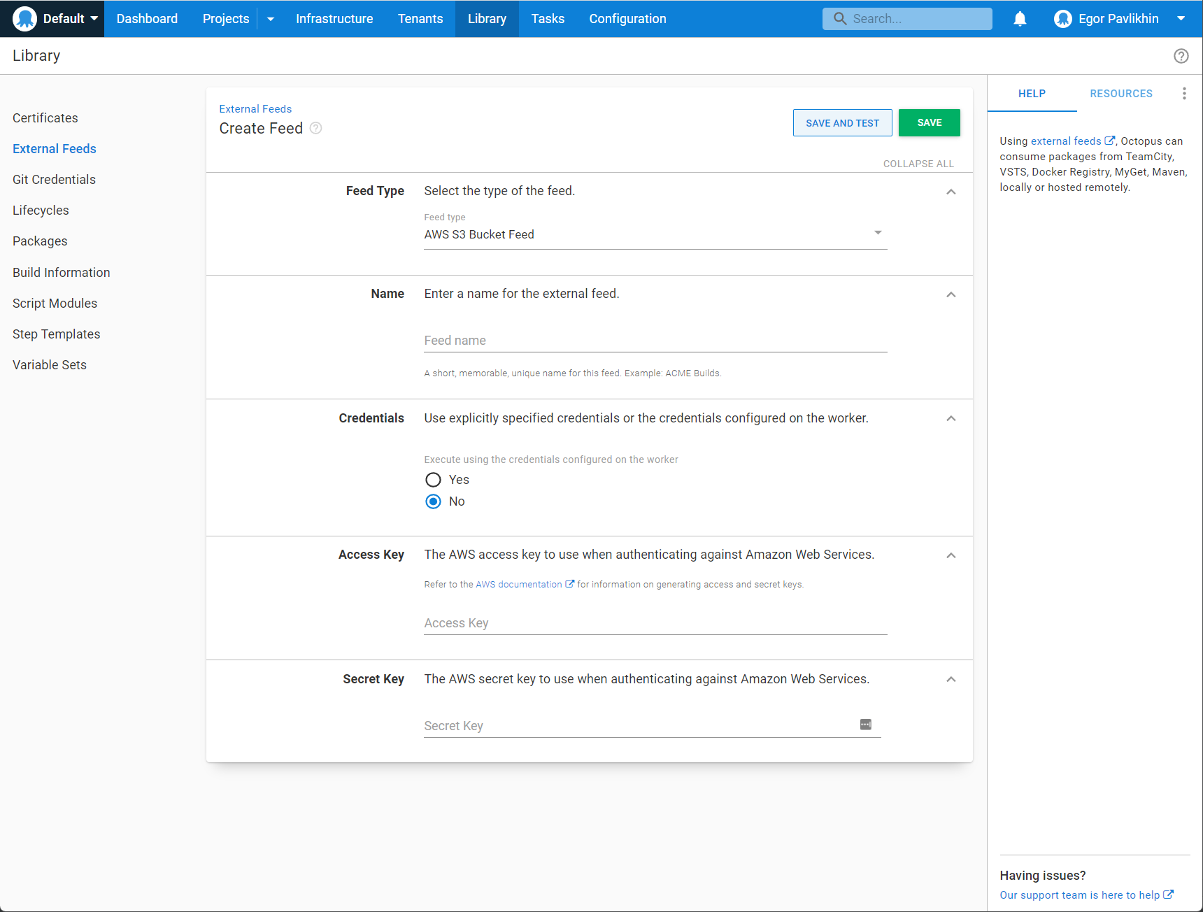 You will then need to select if you want to explicitly specify the key and secret to use to connect to your AWS account or to use the account implicitly defined on your Octopus worker (for example in environment variables). Provide a name for the feed then click Save and test.