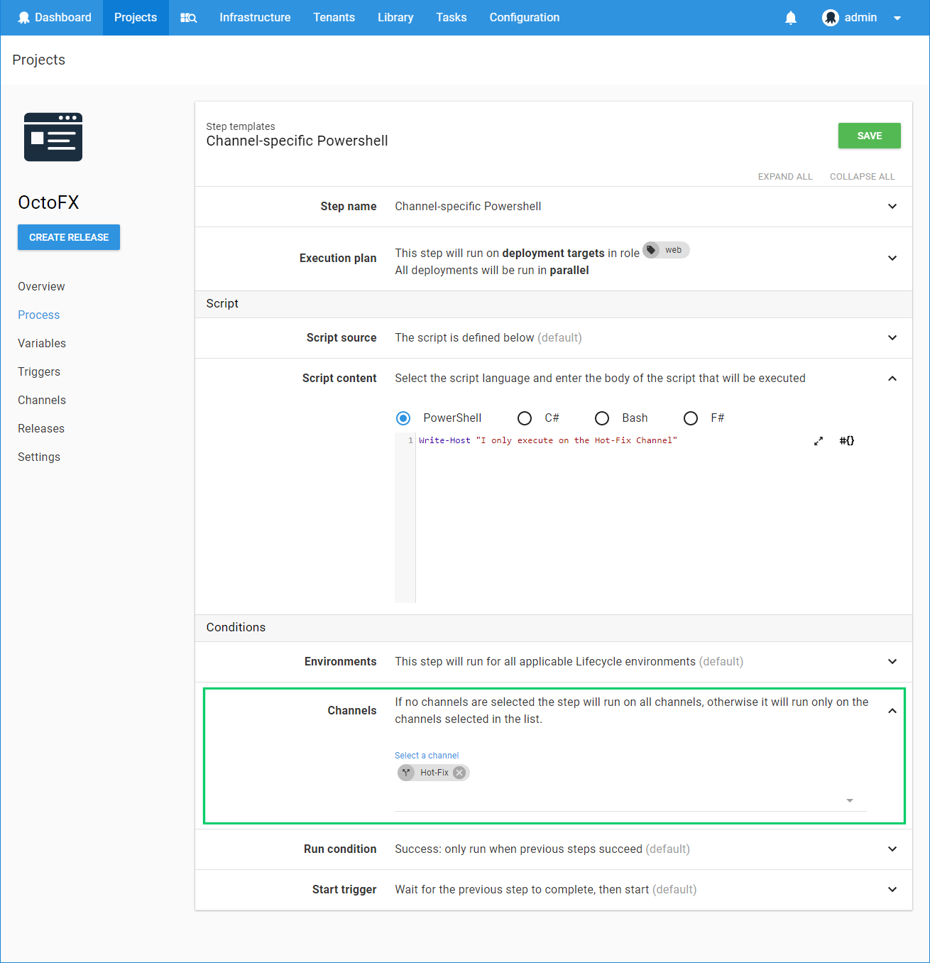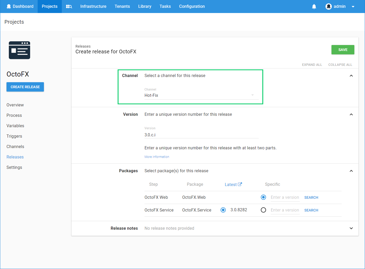 Every Release in Octopus Deploy must be placed into a Channel. Wherever possible Octopus will choose the best possible Channel for your Release, or you can manually select a Channel for your Release.