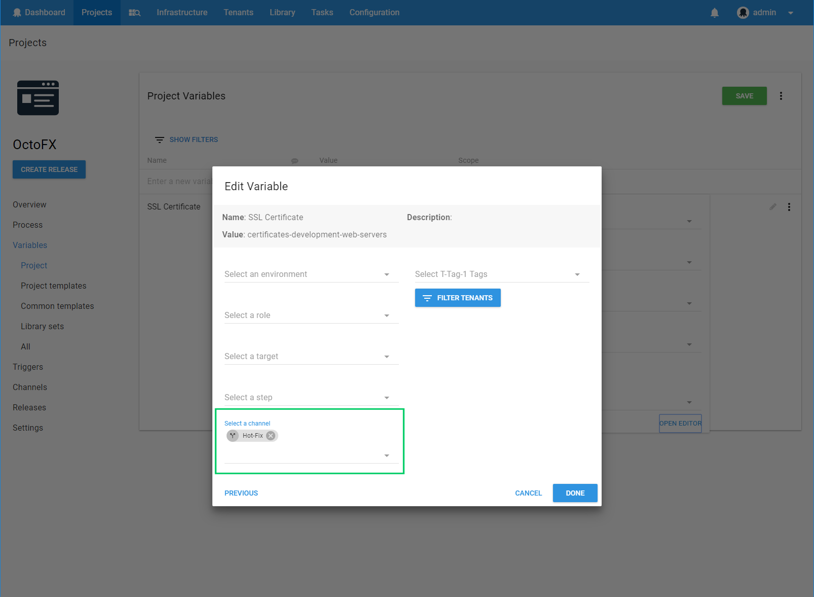 As you release software to different Channels, it’s likely that some of the variables in those Channels will need to be different. Variables can be scoped to specific Channels.