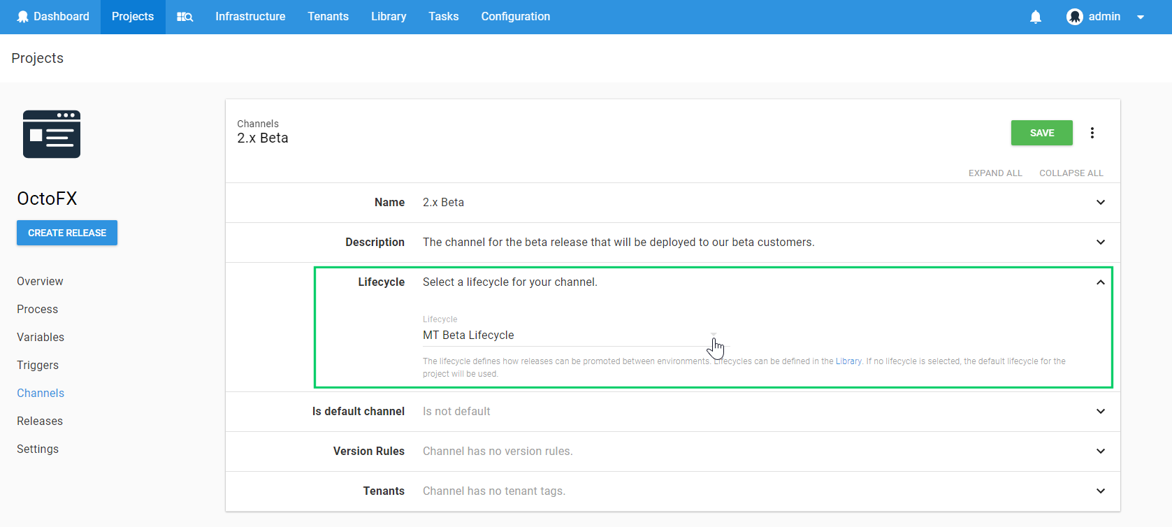 - Select the Lifecycle the channel will use, or allow the channel to inherit the default lifecycle for the project. See the Lifecycle docs for information about creating new lifecycles.