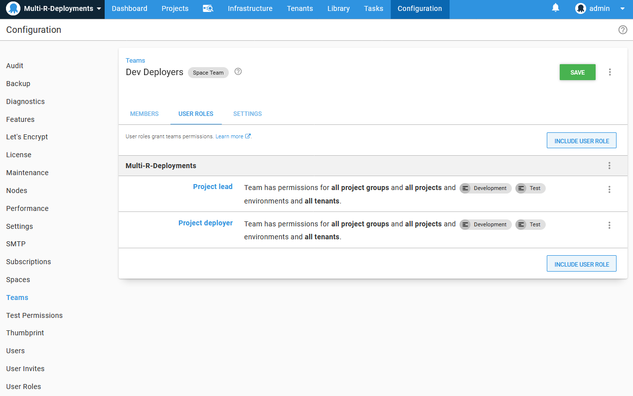 The fourth team is Space Managers Members of this team can do everything in a given space. Out of the box the initial user added to Octopus Administrators is also added as a Space Manager. If you do not need granular access for what users need to do with Octopus relating to Projects, Tenants, Environments you can add them as Space Managers.