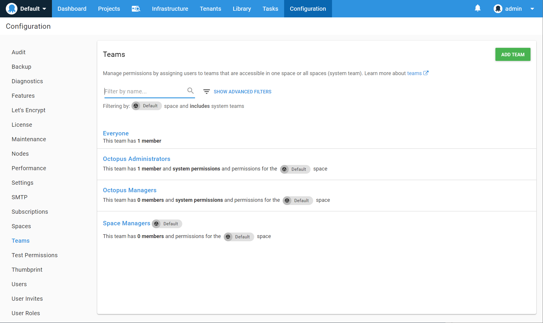 Octopus Deploy comes with several built-in teams.