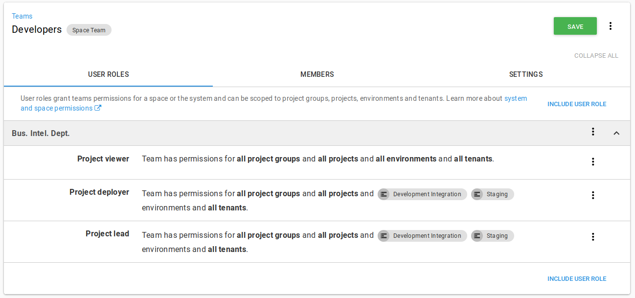 We can repeat this process as many times as necessary to configure the team to your needs. The resulting team configuration screen should now display all of the different roles and their scopes so that you can review them.