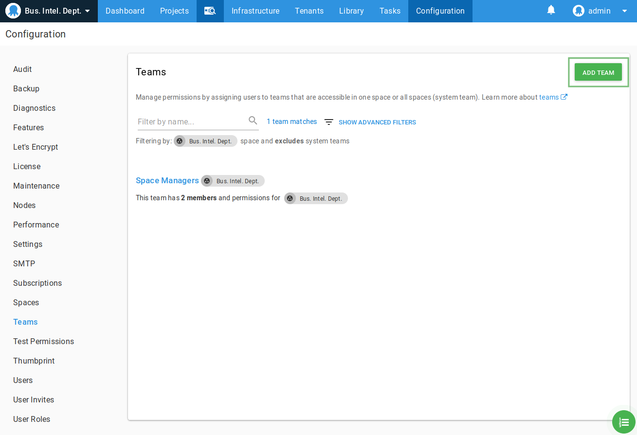 Start by clicking the Teams tab under Configuration in the Octopus Web Portal. Then click Add team.