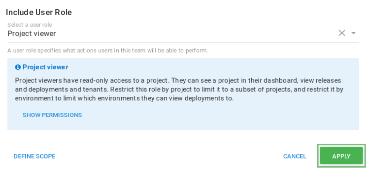 Since our goal is to give members of the Developers team the ability to create and deploy releases in the Development and Staging environments only, we can click Include user role again, this time adding the Project lead role. This role provides all the permissions of the Project viewer role as well as allowing a team member to create and deploy releases. This time, we will click on Define Scope and choose the environments that we would like to scope the role to, before hitting the Apply button.
