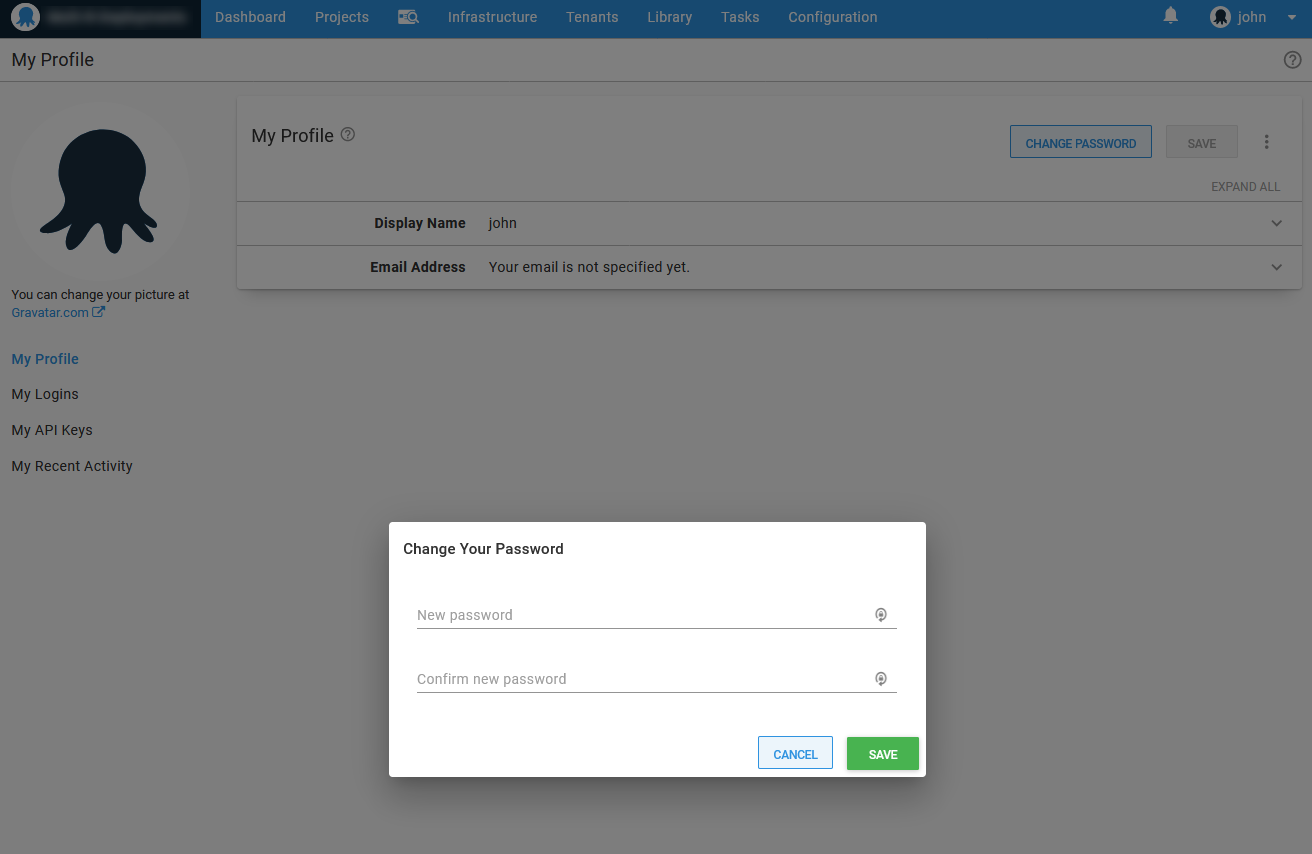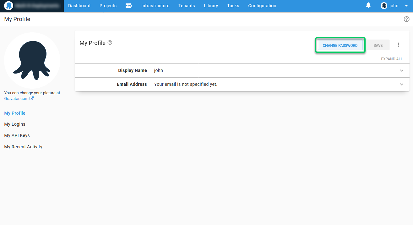 In the Octopus Web UI, click your username in the top right corner of the screen. Select Profile to go to your profile page.