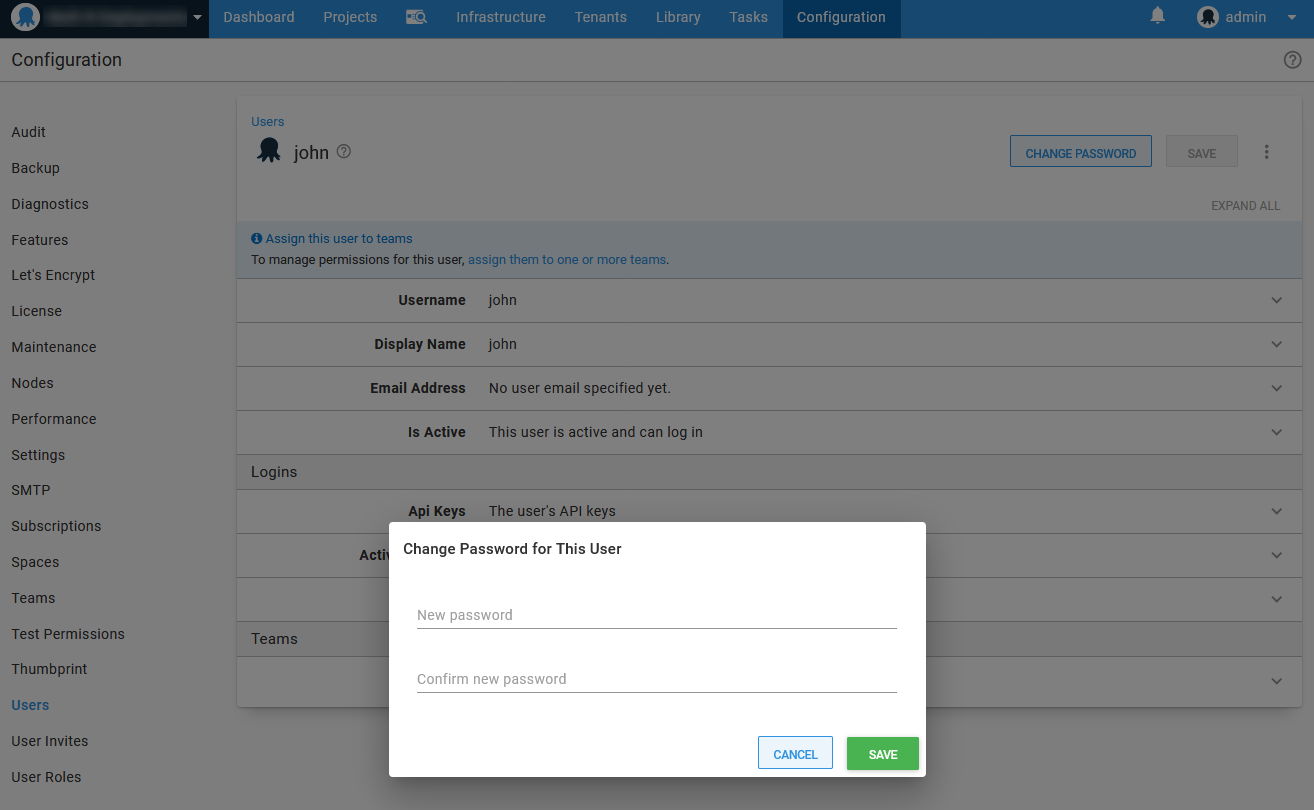 Octopus Server administrators can reset the passwords of other users from the Octopus Web Portal at Configuration ➜ Users.