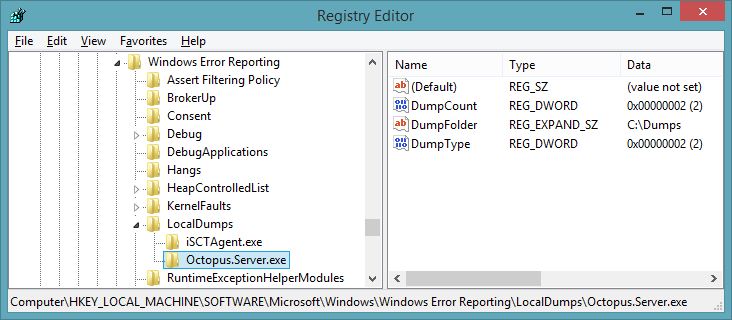 [HKEY_LOCAL_MACHINE\SOFTWARE\Microsoft\Windows\Windows Error Reporting\LocalDumps\Octopus.Server.exe]