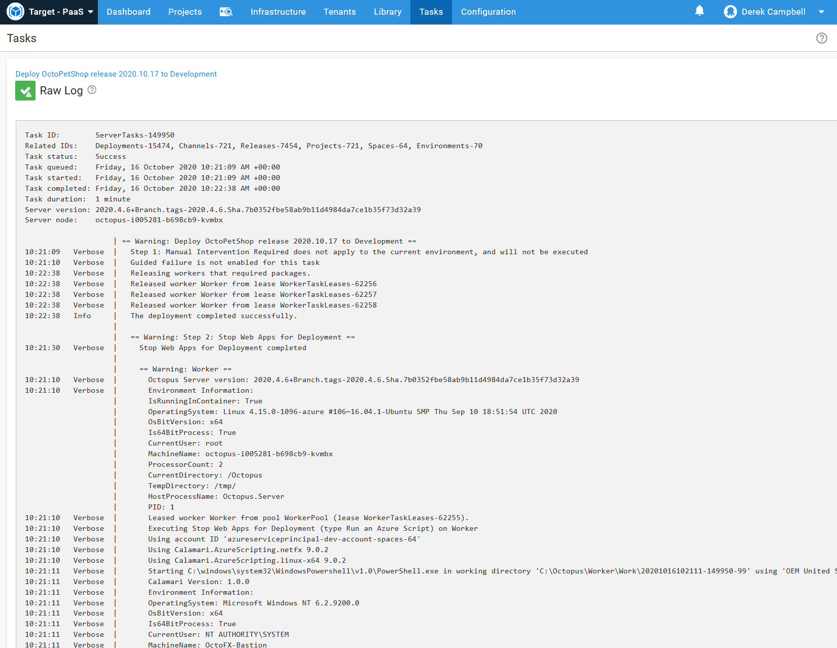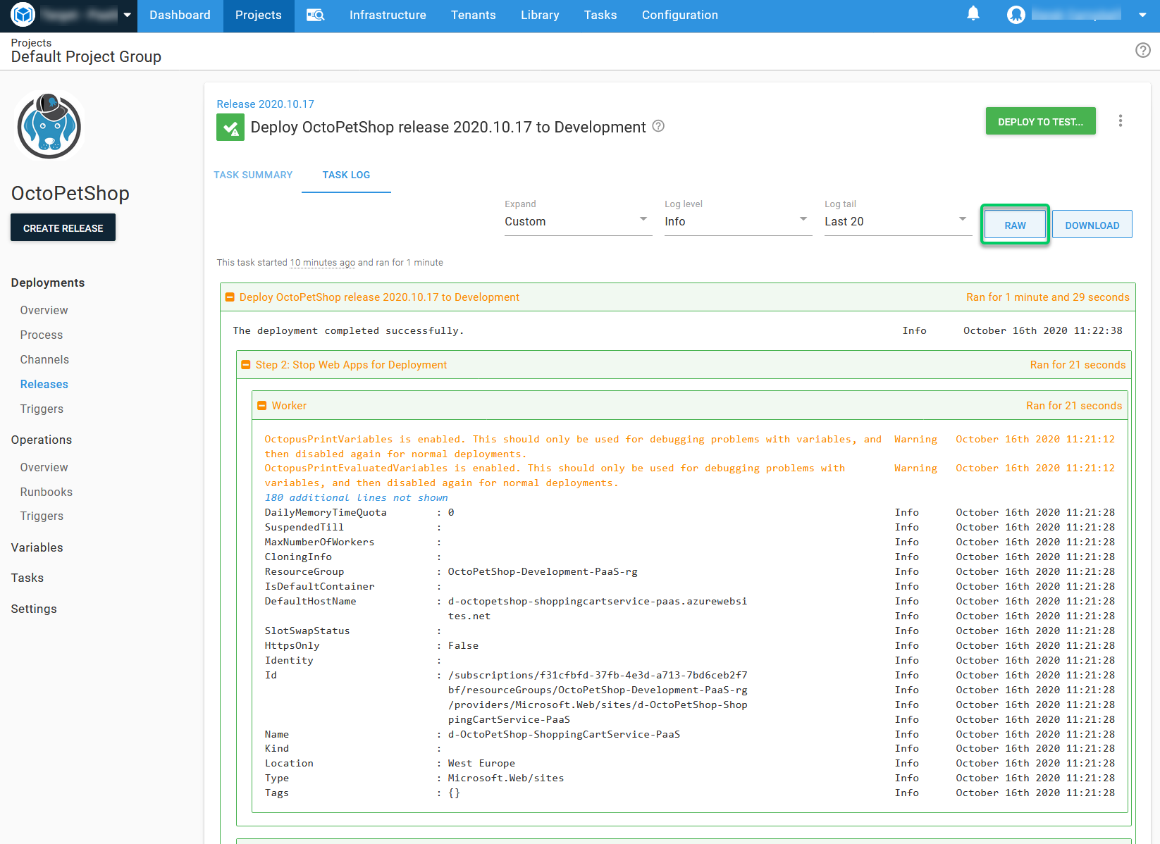 If you wish to troubleshoot this locally the raw log text file containing the entire deployment log will load in Octopus.