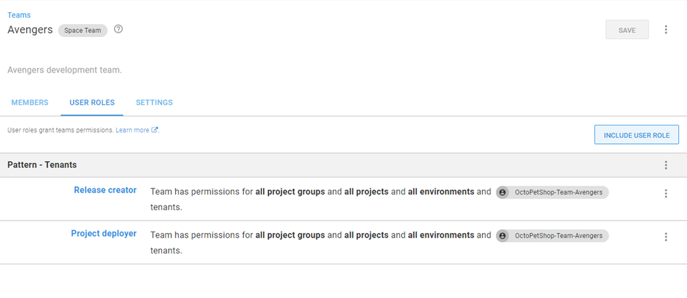 This configures the team with Release Creator and Project Deployer permissions to any project with the Tenant OctoPetShop-Team-Avengers