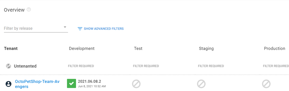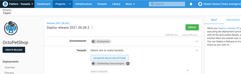 Developers for Team Avengers have the ability to create a release, but only deploy to their own tenant. When deploying to Development, the OctoPetShop-Team-Avengers tenant is automatically selected.