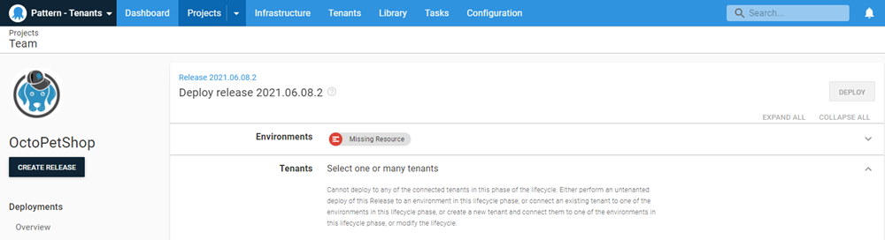Depending on how you scope your team for Environment, because the OctoPetShop-Team-Avengers tenant is only scoped for Development, attempting to deploy to test will result in a missing resource and the DEPLOY button disabled.