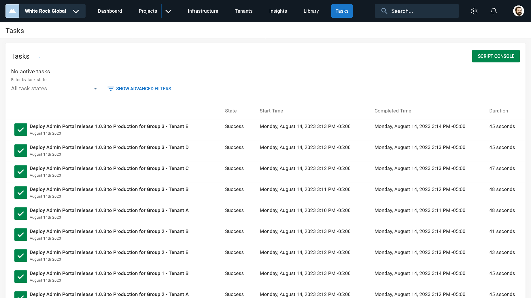 If we look at the deployment to Group 1 - Tenant E, we see that it no longer had to wait for other tasks, and each of the steps finish quickly. This is important if you need to minimize the times between certain steps running.