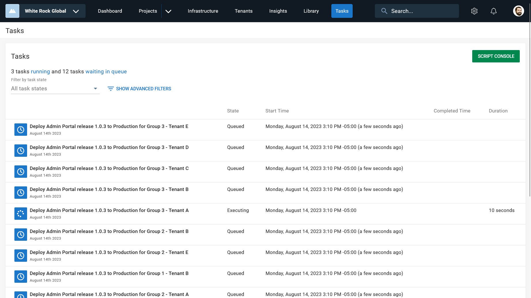 If we deploy a release to all tenants at the same time now, we see that three tasks are running while the others are queued. That is one task per hosting group. While the other tasks are queued, tasks from other projects are able to run. Before making the change to the concurrency tag, all of these tasks would run concurrently and potentially block tasks from other projects from running.