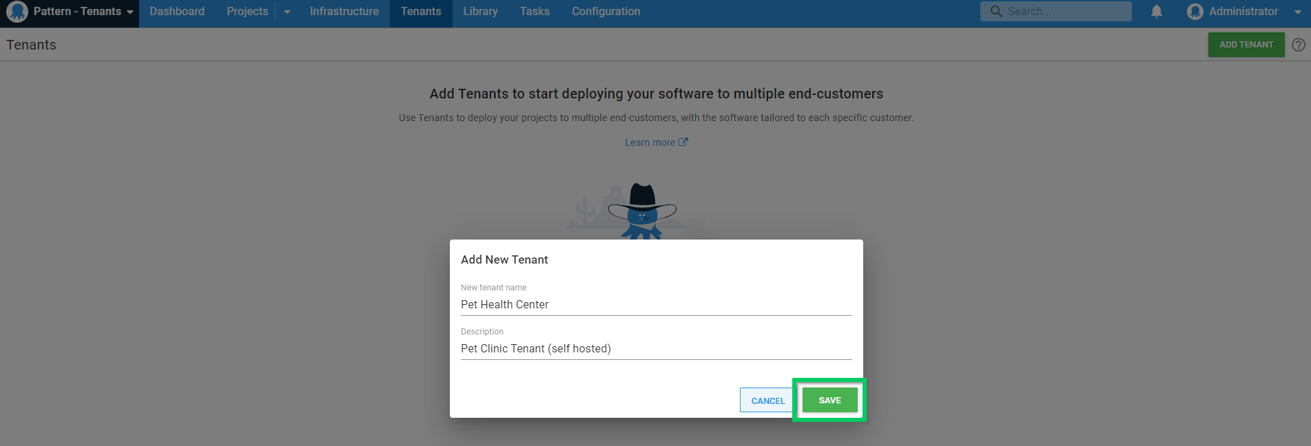Enter the name you want to use for the tenant and click the SAVE button: