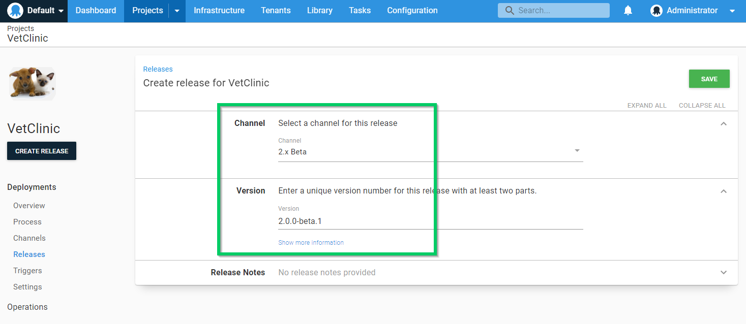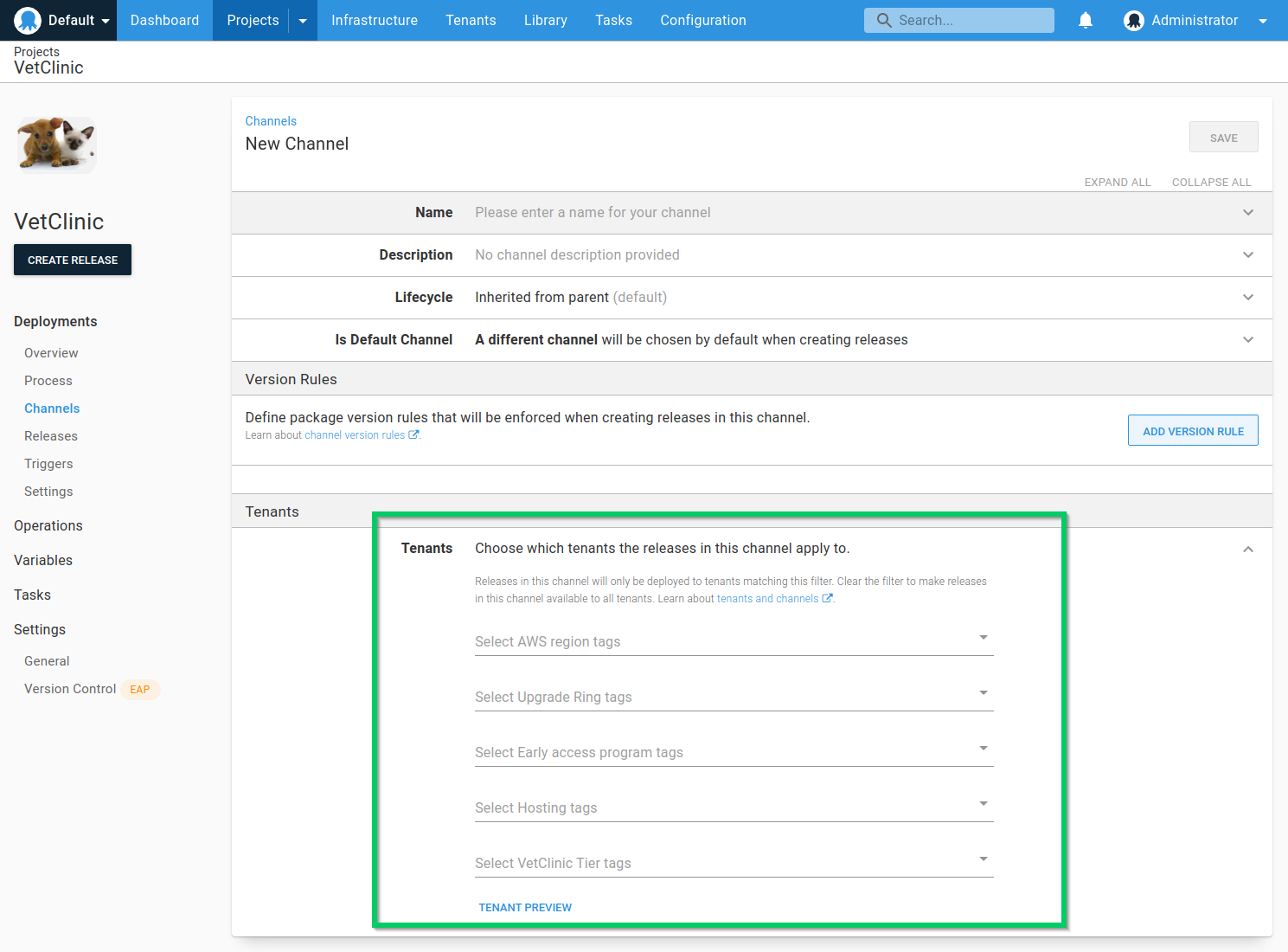 Now we will configure the project channels to make sure we never deploy any releases to pinned tenants. We will do this using a similar method to the EAP Beta program, but in this case, we are making sure none of the channels allow deployments to tenants tagged as pinned.