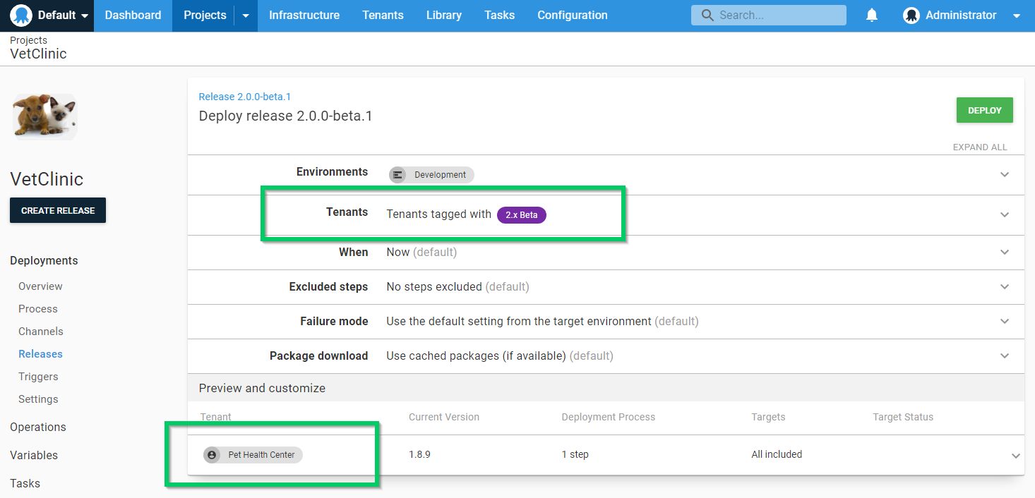 When you deploy this release, you will be able to choose from the limited set of tenants tagged with the Tester tag and deploy into the test environments, but no further.