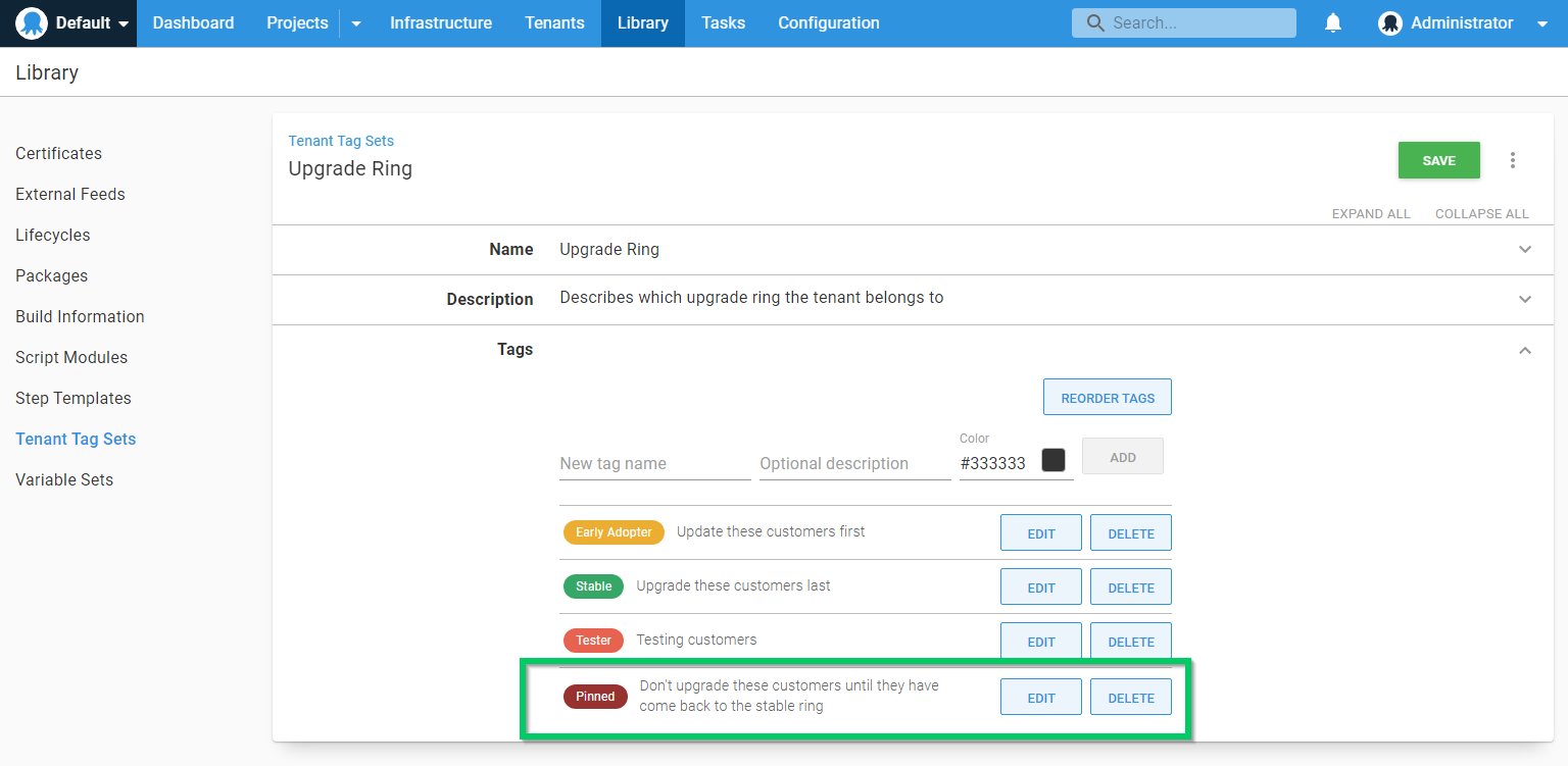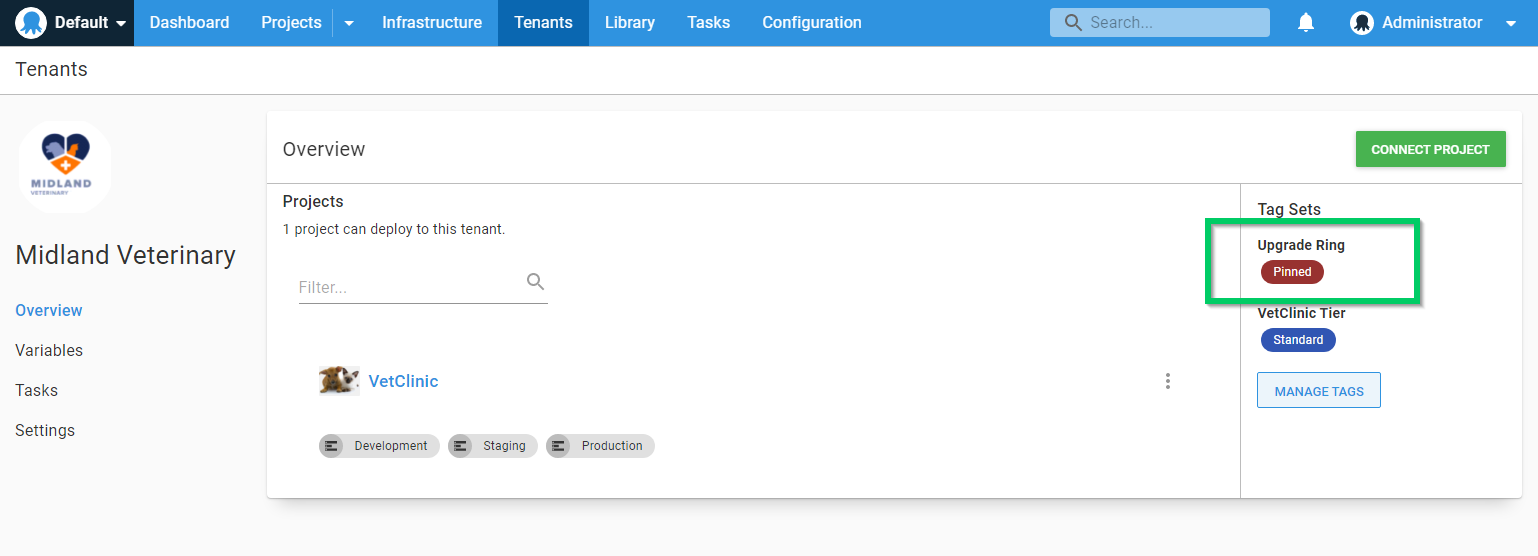 Find a tenant you want to pin and apply the Pinned tag, removing any other tags. This will prevent you from deploying any releases to this tenant.