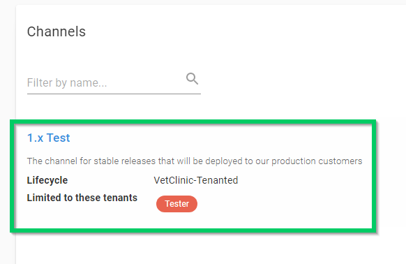 Create a channel called 1.x Test and restrict its use to tenants tagged with Tester