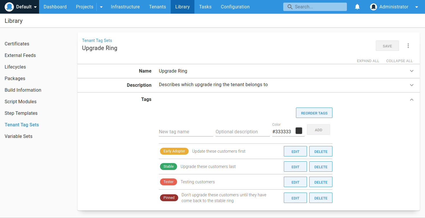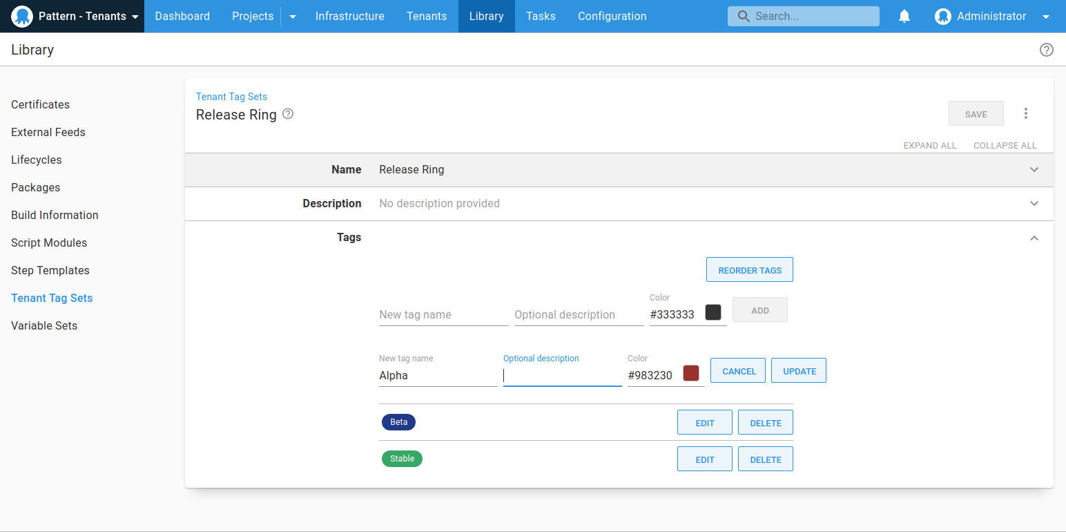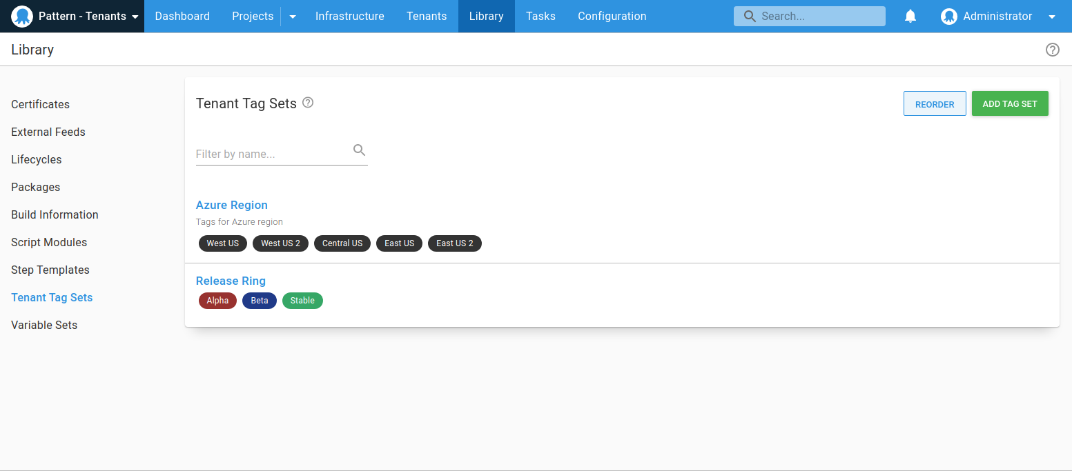 Go to Library ➜ Tenant Tag Sets to create, modify and reorder tag sets and tags.