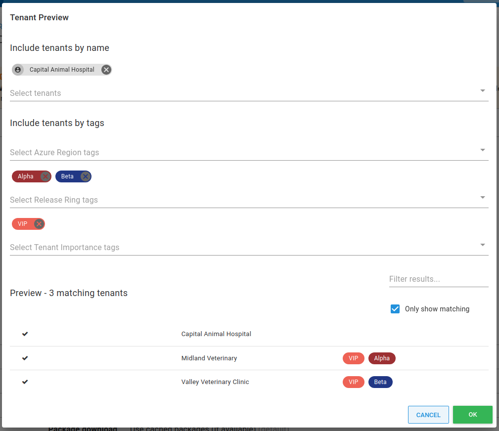 Consider an example deploying a release to the tenants tagged with the Alpha tag in the Release Ring tag set.