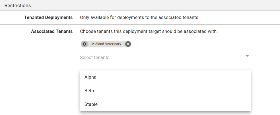- Scoping a deployment target to one or more tenants when registering a new Tentacle - read more in our tenant infrastructure section.
